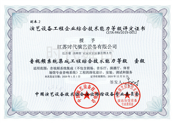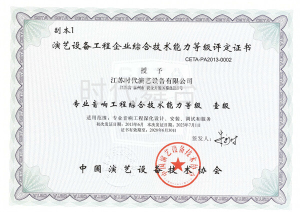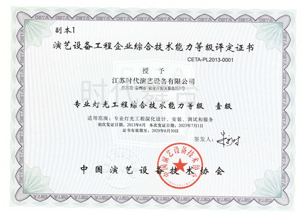 時代舞臺具備中國演藝設(shè)備技術(shù)協(xié)會頒發(fā)的舞臺機(jī)械壹級、專業(yè)燈光壹級、專業(yè)音響壹級、音視頻系統(tǒng)集成壹級的行業(yè)資質(zhì),以及住房和城鄉(xiāng)建設(shè)部頒發(fā)的電子與智能化工程專業(yè)承包壹級、建筑裝修裝飾工程專業(yè)承包壹級、建筑機(jī)電安裝工程專業(yè)承包資質(zhì)、鋼結(jié)構(gòu)專業(yè)承包資質(zhì),為國內(nèi)演藝設(shè)備行業(yè)的優(yōu)良企業(yè)。